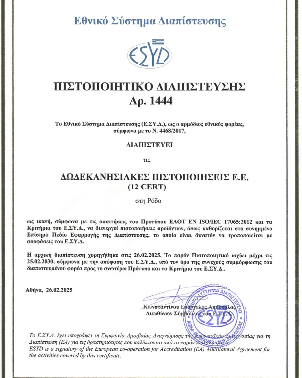 Με μεγάλη χαρά ανακοινώνουμε ότι στις 29 Οκτωβρίου 2025 ο φορέας μας έλαβε την επίσημη Διαπίστευση για το πρότυπο HACCP κατά Codex Alimentarius από τον Αμερικανικό Φορέα Διαπίστευσης “UNIVAB”, με αρ. Πιστοποιητικού Διαπίστευσης Cert ID: CAB–94-PRB.